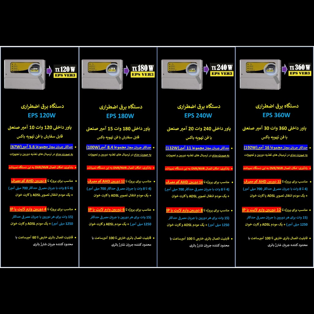 دستگاه های سری EPS در چهار توان 120 وات ، 180 وات ، 240 وات و 360 وات و با ویژگی های مشابه ، در داتیس الکترونیک شرق تولید می گردد که تنوع تولیدی در توان دستگاه ها ، امکان به کارگیری آن را در پروژه با ابعاد مختلف مهیا می سازد.