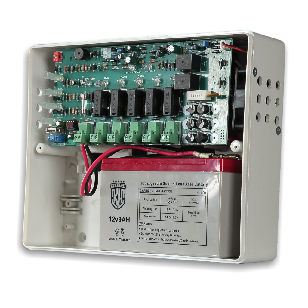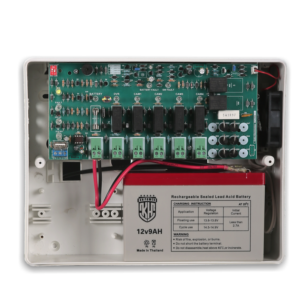 ✅ در صورت تشخیص خطا توسط سیستم عیب یاب هوشمند، LED سبز رنگ OK یا وضعیت نرمال خاموش شده و LED خطا رخ داده است به رنگ قرمز به صورت چشمک زن روشن خواهد شد و در پنل LED داخلی خطا به تفکیک مشخص می گردد که موارد تفکیک شده شامل تعیین فیوز سوخته در خروجی های دستگاه (DVR، CAM1 … CAM4) ، اشکالات مربوط به سوئیچینگ (SW Fault) مانند ولتاژ و جریان دهی و کارکرد سوئیچینگ ، اشکالات مربوط به باتری (BATT Fault) شامل مشکل در فرسوده بودن باتری ، عدم امکان شارژ باتری، مشکل در مدار شارژر باتری و اتصال کوتاه در مدار شارژر می باشد.